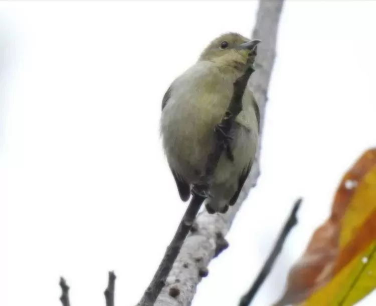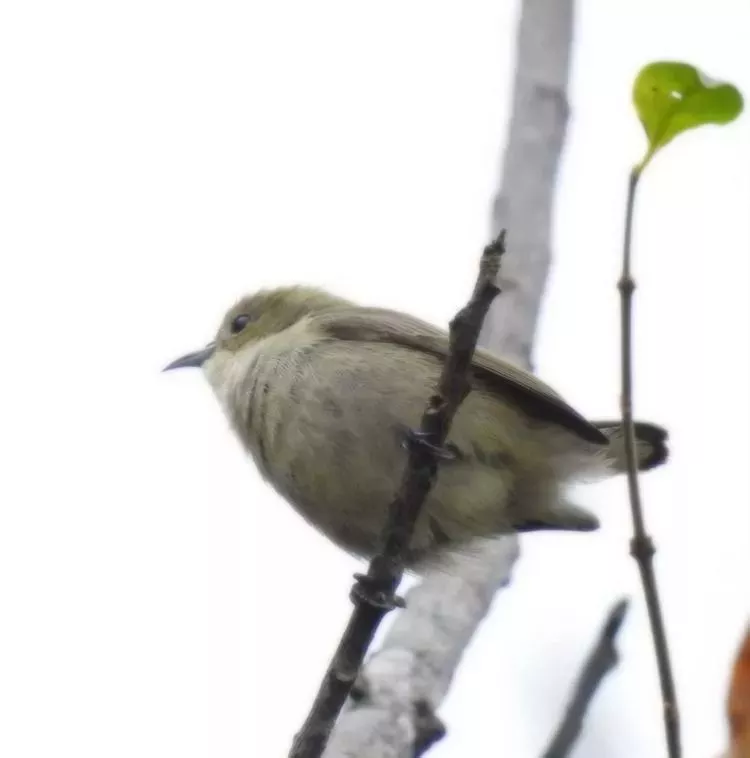 我踮起腳尖,慢慢地靠近那棵樹。一只體型較小的鳥擺動著身體,在樹梢間歡跳著。我仔細一看,它背部呈褐綠色,胸部淺黃,喙很鋒利。
