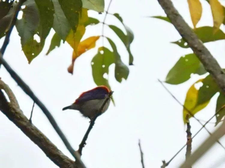 我們繼續(xù)往前走,又聽見了那個熟悉的叫聲。旁邊的椰子哥哥指著樹枝說道:"朱背啄花鳥的雄鳥!剛才看到的那只是雌鳥!″我驚喜地打量著這只雄鳥。它的背部像火紅的杜鵑花兒,又像燃燒的小火苗;翅膀黑得像燒焦的木炭,但是閃著金屬的亮澤。