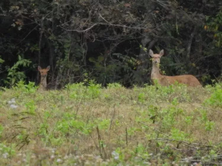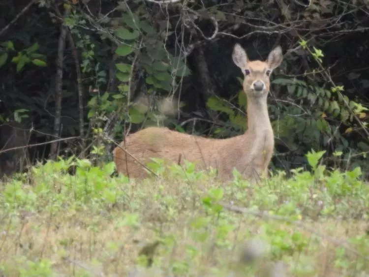 剛進入保護區(qū),只見一只坡鹿謹慎地盤坐在遠處的草坪上。它一見我們就緊張地跑進了叢林里。半晌兒,那只母鹿又從林子里探出了頭,警覺地觀察著四周。經過一番試探之后,它才小心翼翼地走出來,后面還跟著一只小鹿。這個依偎在媽媽身邊的可愛的小寶寶長得可精神了!高高的鼻梁下面裂開一張小嘴,烏黑的眼睛閃閃發(fā)光,小耳朵直挺挺地豎起來。