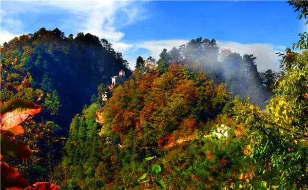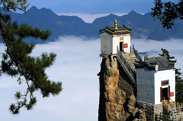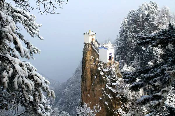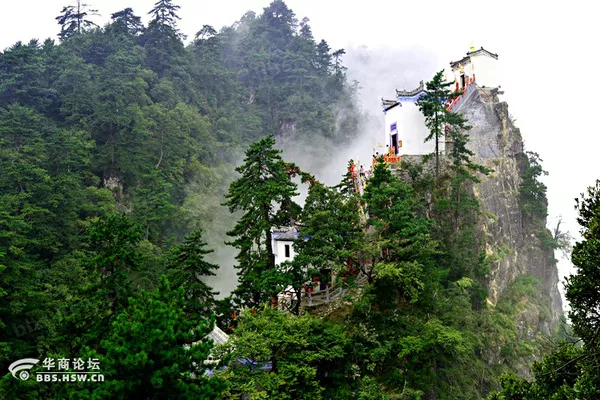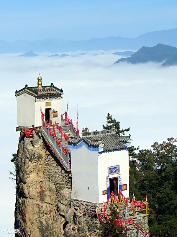 2、其道教古建筑群建于明正德年間(1505-1521),由一館、一塔、一廟、一堂、九殿組成,風(fēng)格古樸而清雅。尤其金頂觀音殿,建于萬仞絕頂之上,三面懸于萬丈深淵,可謂鬼斧神工,令人嘆為觀止,被稱為"秦楚一柱,絕頂?shù)烙^"。