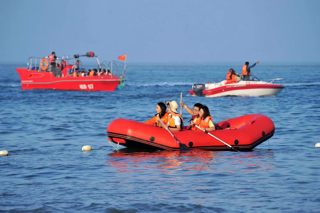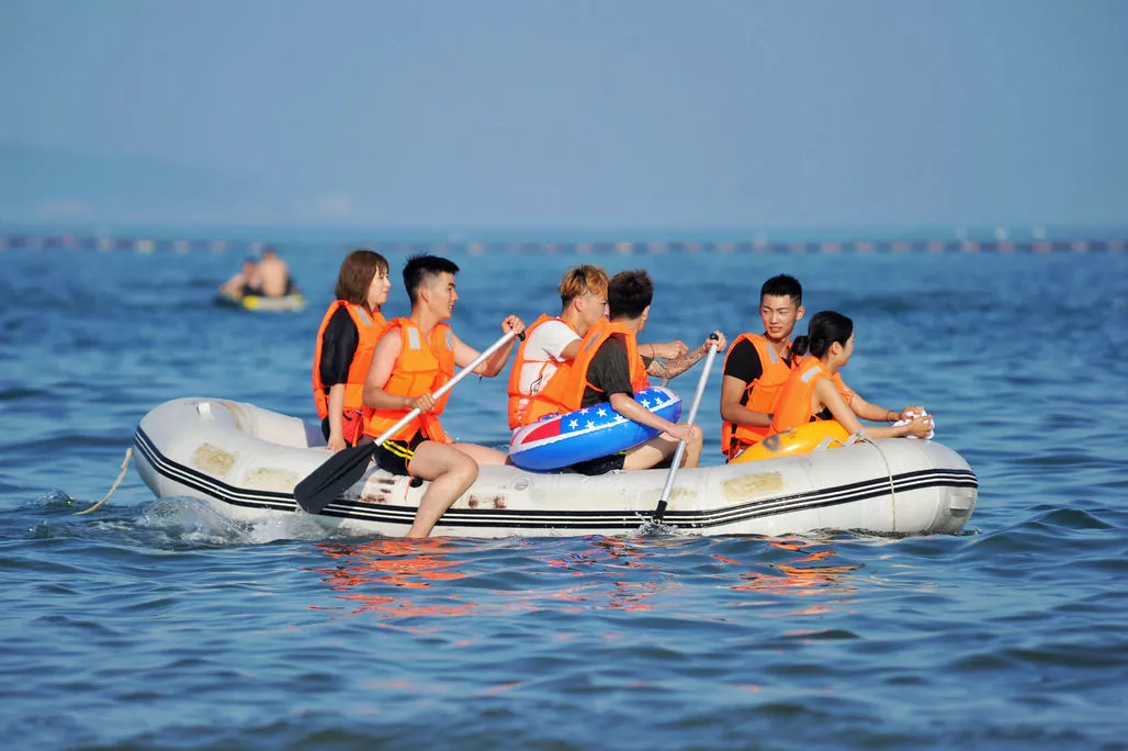 由于海水溫度海不適合長時間游泳,現(xiàn)在還上乘船和劃船的生意特別好,很多年輕人都喜歡租一條橡皮艇在海上劃船,男女搭配,劃船也不累。