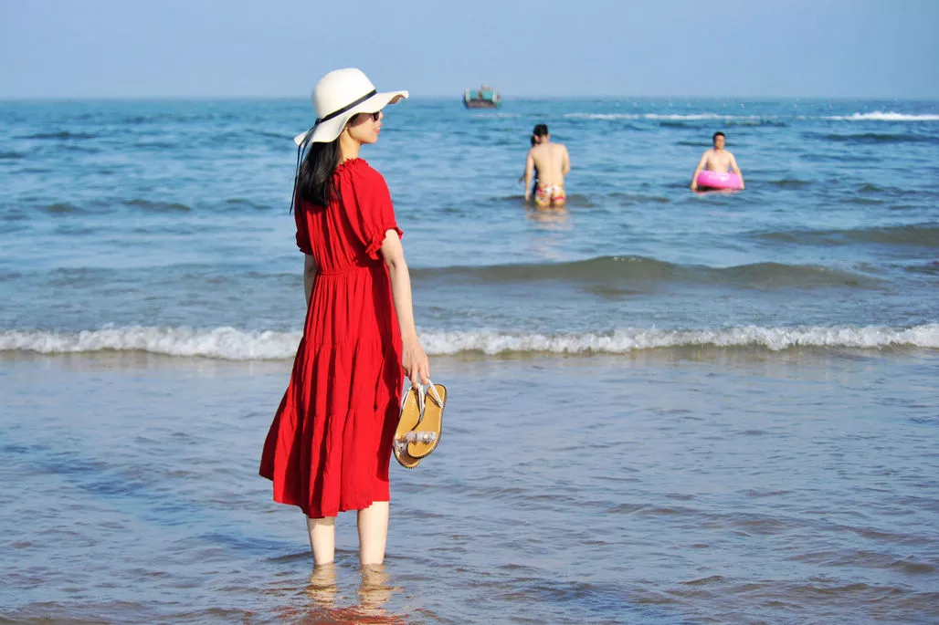一位美女一襲紅衣站在海水中,小編感覺這個景致不錯,馬上摁下快門。