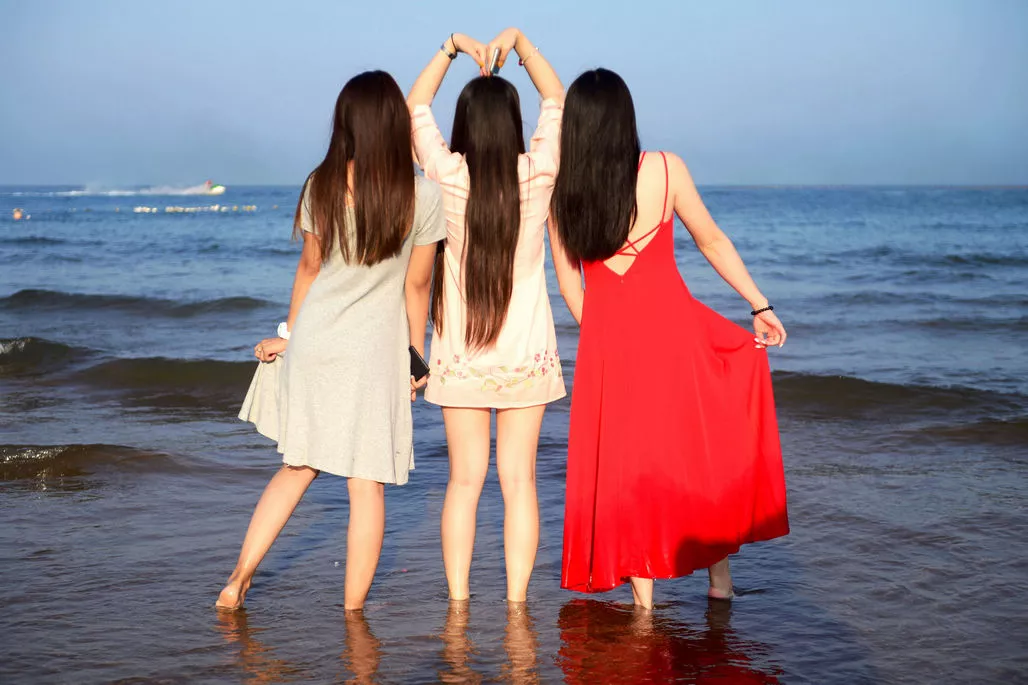 也有幾位美女小伙伴一起在海邊拍攝各留念照的,這3位美女讓小伙伴來張背影照,也很不錯。