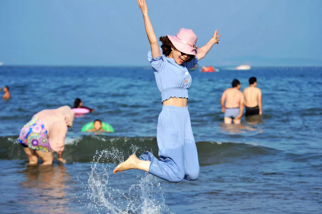 雖然海水還是有點涼,但阻止不了遠道而來的游客們,既然來了,就得下到海里去體驗一下海水的清涼。圖中一位美女跳起來讓同伴給拍照,恰巧也進入了小編的鏡頭。