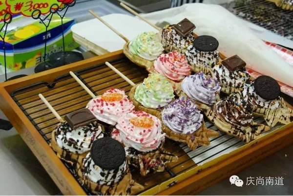 (1).鯽魚餅與冰淇淋的相遇~~‘冰激鯽魚餅’上南大吉里夜市里的代表小吃~傳聞中的‘冰激鯽魚餅’基本上來到大吉里市場的吃貨們都會(huì)來嘗一次它的味道喲,它也是在各大博客上登場的??屠?。在平時(shí)韓國人熱衷的鯽魚餅中加上酸奶冰淇淋,奶酪巧克力中加入菠蘿塊,只要嘗一口就會(huì)讓你無法割舍的喲?。a魚餅有奶油泡芙和豆沙兩種口味可選擇)飯后來一個(gè)‘冰鯽魚餅’不失為最好的餐后甜點(diǎn)(