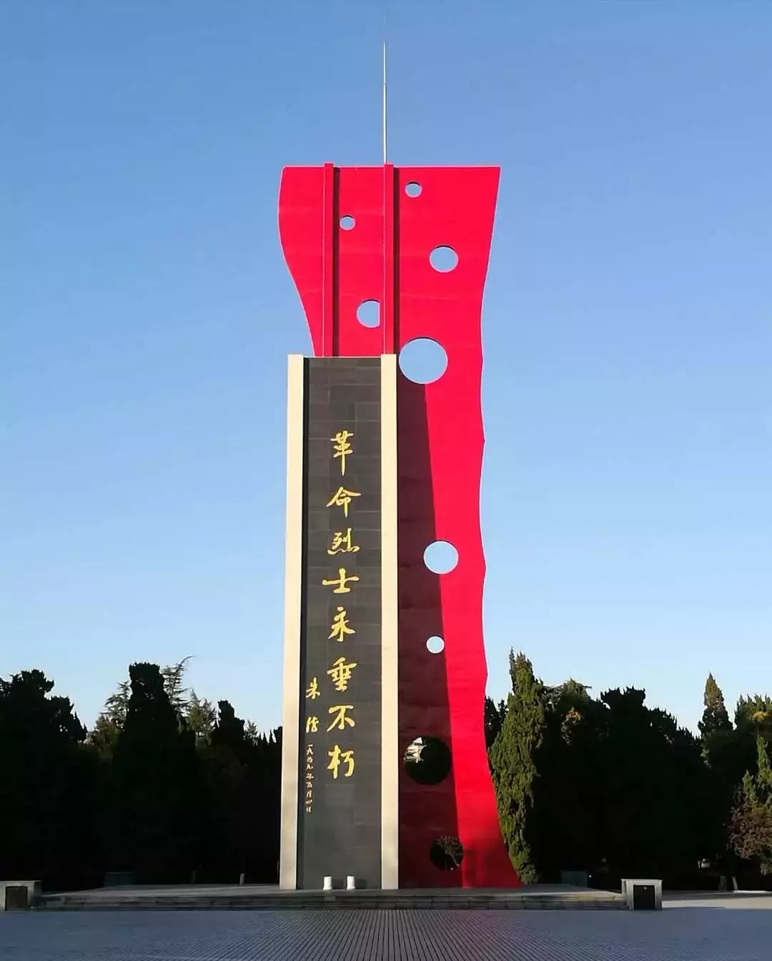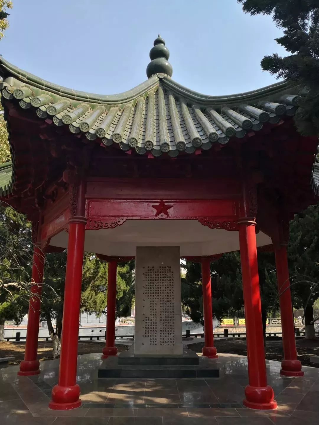烈士墓后的紀念亭,與烈士塔遙相呼應(yīng),六角尖頂,綠色琉璃,紅色廊柱。亭內(nèi)正中立有2.2米高大理石碑,潔白如玉。碑身用隸書鐫刻著中共如東縣委員會、縣人民委員會攥寫的碑文。亭畔數(shù)十棵樹齡60余年的龍柏和7米多高的棕櫚,郁郁蔥蔥,終年長青。