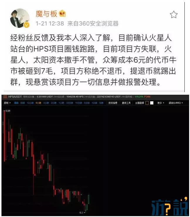 不久前,許子敬成為眾矢之的。據(jù)幣圈大V@魔與板爆料,確認(rèn)火星人站臺(tái)的HPS項(xiàng)目已經(jīng)圈錢跑路,項(xiàng)目方處于失聯(lián)狀態(tài)。HPS代幣由眾籌成本的6元被砸至7毛,但項(xiàng)目方稱絕不退幣,提退幣就被踢出群。