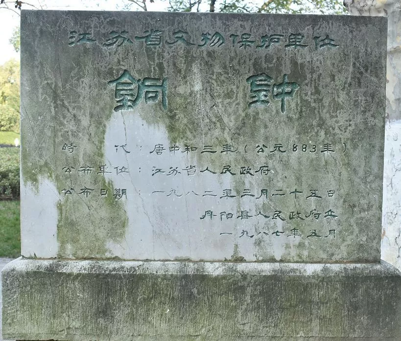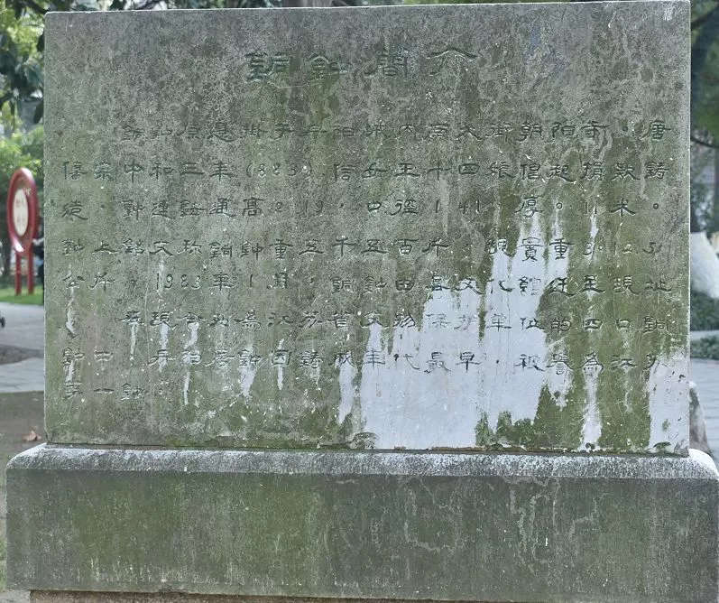 長廊的東面是唐中和銅鐘所在地,曾因鐘樓被毀多次墜地,至今完好。銅鐘高2.14米,厚0.11米,口徑1.41米。大鐘銘文稱:銅鐘重五千五百斤,據(jù)銘文可知,大鐘鑄于唐中和三年(883年)。1984年銅鐘移至公園內(nèi),底有6只小石獅烘托,并建木結(jié)構(gòu)六角亭加?xùn)疟Wo(hù)。