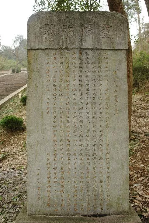 《重修王陽明先生墓碑記》:王陽明,名守仁,字伯安,紹興府余姚人。弘治十二年進(jìn)士。歷任刑部、兵部主事,左檢都御史,巡撫南贛,總督兩廣,官至南京兵部尚書,封新建伯。先生,少穎悟,博覽經(jīng)籍,后倡導(dǎo)心學(xué),主張“知行合一,以致良知”為旨?xì)w,世稱“姚江學(xué)派”,于明中葉后,影響甚巨,播揚(yáng)東瀛。嘉靖七年,先生兵卒于江西南安,享年五十有七......