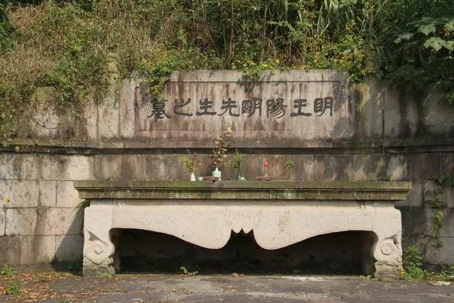 王陽明墓,位于著名的旅游景點(diǎn)“蘭亭”南1公里的花街村“仙暇山莊”內(nèi)。王陽明(1472年—1529年),浙江余姚人,名守仁,號(hào)陽明子,世稱陽明先生。王陽明精通儒佛道三教,還能統(tǒng)軍征戰(zhàn),是中國(guó)歷史上少有的文武全才大儒。去世后被謚“文成”,后又追封為“新建侯”。走到路口,只見一條花崗巖鋪筑的神道已被荒草淹沒,顯得十分凄涼?!懊魍蹶柮飨壬埂卑藗€(gè)大字,系著名書法家沈定庵題書。有鮮花綠