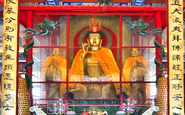 鐘靈禪寺既是朝圣修行之地,也是旅游觀光勝地。寺內(nèi)造像眾多,工藝精湛,其中不泛鎏金、玉石造像。上圖大雄寶殿的須彌臺(tái)上供奉著佛祖釋迦牟尼和阿難迦葉倆位弟子,兩側(cè)還供奉著文殊菩薩普賢菩薩,合稱華嚴(yán)三圣。