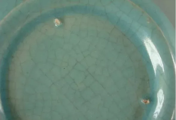 第三,支釘粗大,支釘與餅粘接不牢。應(yīng)屬汝窯瓷器的初級(jí)階段。第二階段以天青釉瓷器為主,傳世汝窯瓷器形制在這一階段應(yīng)有盡有,并出現(xiàn)一些新器類。燒造工藝趨于成熟,絕大多數(shù)匣缽?fù)獗谕磕ㄒ粚幽突鹉啵龎|餅的支釘小而尖,新出現(xiàn)了支燒墊圈。而第二階段也就是成熟時(shí)期的天青釉類汝窯瓷器的生產(chǎn)時(shí)間段。