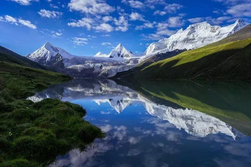 薩普神山海拔6956米,冰川經(jīng)過(guò)千萬(wàn)年來(lái)的亙古蠻荒,峰頂皚皚白雪終年不化。雪水化作的湖泊空靈娟秀,四周簇?fù)矶鴣?lái)的冰川光怪陸離。冬季,湖泊凝結(jié)成一面藍(lán)色冰晶;到了仲夏時(shí)分,湖面翠色欲流,波平如鏡,倒映著藍(lán)天、白云、冰川和雪峰,湖畔花紅草綠,水草豐茂,三兩只牦牛悠閑漫步于野草水波之上。
