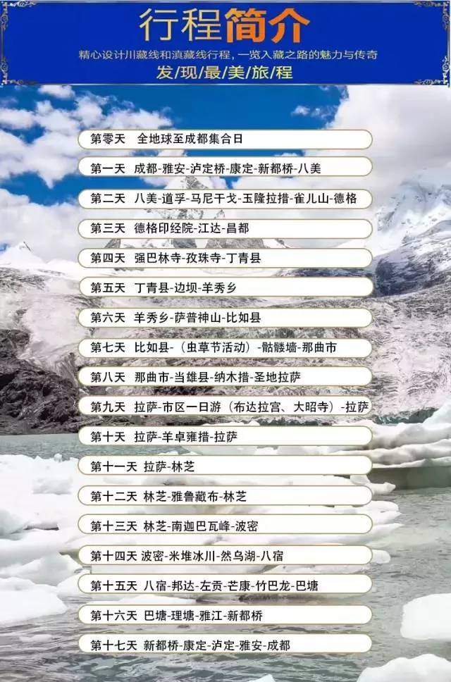 雄奇壯觀的雪山,原始茂密的森林,寧?kù)o遼闊的草原,絕美靜謐的海子,雪山映襯 的藏寨、悠揚(yáng)激蕩的牧歌......一路向西,沿著被《中國(guó)國(guó)家地理》雜志贊譽(yù)為中國(guó)最美 麗的景觀大道,探秘康巴文化核心區(qū)域,感受藏區(qū)的美麗風(fēng)景、文化藝術(shù)民俗風(fēng)情、 建筑藝術(shù),沿途我們將穿越二郎山隧道,翻越折多山、高爾寺山、剪子灣山、海子山、 業(yè)拉山、色季拉山、米拉山等多座雪山埡口;遙望貢嘎念青唐古拉山、南迦巴瓦峰等多座雪山;一路淌漾青衣江大渡河、雅礱江、金沙江、瀾滄江、怒江、帕隆藏布 江、雅魯藏布江、尼洋河拉薩河等江河水域,體驗(yàn)高山峽谷形成的巨大落差....2019年 我們一起相約走進(jìn)這條神奇的秘境之路。