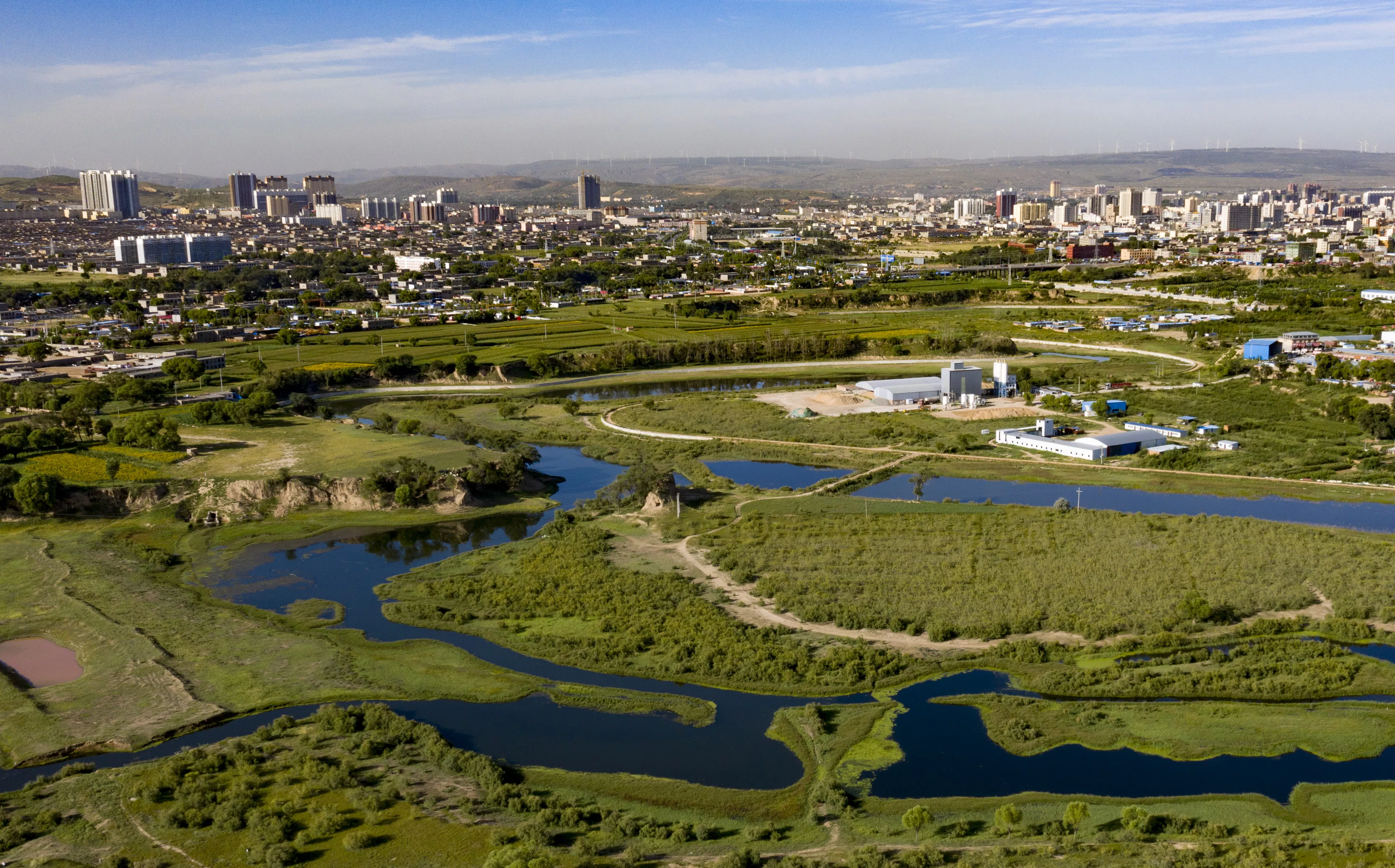 8月16日無(wú)人機(jī)拍攝的靖邊縣城旁的蘆河湖泊濕地。