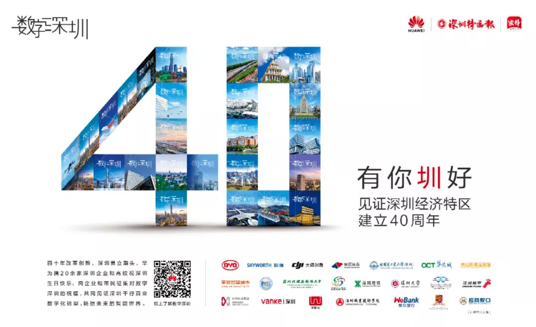 昨天,在深圳經(jīng)濟特區(qū)建立40周年40天倒計時之際,華為攜手比亞迪、創(chuàng)維、大疆創(chuàng)新、國信證券、哈爾濱工業(yè)大學(深圳)、華僑城、華潤置地深圳、平安智慧城市、鵬城實驗室、深圳北理莫斯科大學、深圳巴士集團、深圳地鐵、深圳大學、深圳國際會展中心、深圳航空、深圳機場、深圳萬科、深圳智慧城市集團、深圳職業(yè)技術(shù)學院、微眾銀行、香港中文大學(深圳)、招商蛇口等20余家深圳企業(yè)、機構(gòu)和高校發(fā)起“有你圳好,見證深圳經(jīng)濟特區(qū)建立40周年”系列主題活動?;顒右浴皵?shù)字深圳”為場景,開啟線下創(chuàng)意展示和線上分享,一同為深圳送上生日祝福。