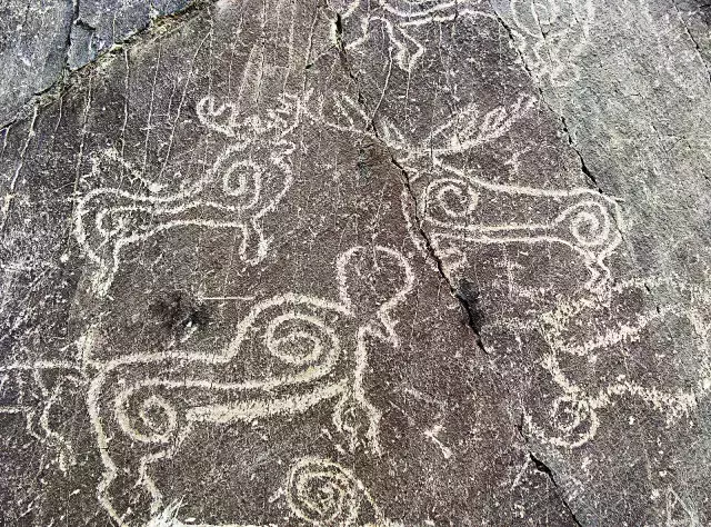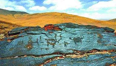 日土巖畫(huà)班公湖湖盆南部東部近兩、三百平方公里的面積內(nèi),分布有魯日朗卡、阿壟溝、那布龍、塔康巴、布顯、康巴熱久、日姆棟、過(guò)巴、曲嘎?tīng)柷嫉?3處巖畫(huà)點(diǎn)。這些巖畫(huà)圖像均用敲琢法完成,大致屬于吐蕃時(shí)期之前的早期金屬時(shí)代。