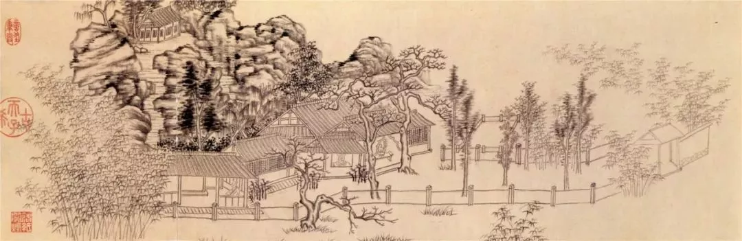 徐賁于明洪武七年(1374)受如海禪師之請為獅子林園作畫。徐畫與倪畫最大的不同,在于其分十二景描繪了獅子林園景。