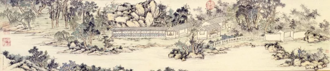 蕫誥《御制文園獅子林圖》卷長24厘米寬184厘米乾隆三十九年,在熱河避暑山莊仿建的“獅子林”落成,命名為“文園獅子林”,從而形成京師、塞北和江南三座獅子林鼎足而立的局面,極一時之盛。園中不僅分別收藏了乾隆帝自己的《獅子林圖》臨本,同時他還命內(nèi)廷畫家以此為題材進行創(chuàng)作。董誥的此卷《文園獅子林圖》就是在這樣的背景下創(chuàng)作的。此圖表現(xiàn)的是承德避暑山莊中的獅子林,畫面布局結(jié)構(gòu)合理,遠(yuǎn)近虛實處理