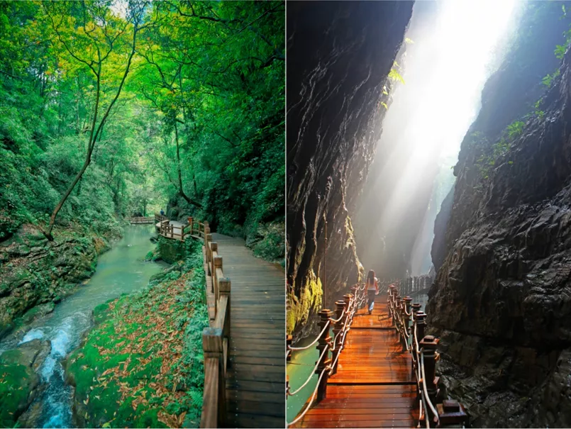 黑山谷,集“山水泉林洞”于一體,融“奇險峻秀幽”于一身,“一島、三谷、五峽、七區(qū)、十二峰、三十六橋、九十九瀑、一百零八潭”等景觀中以秀瀑、浮橋、渝黔大裂谷最為著名。