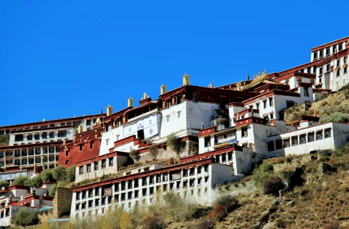 布達(dá)拉宮依山壘砌,群樓重迭,殿宇嵯峨,氣勢(shì)雄偉,堅(jiān)實(shí)墩厚的花崗石墻體,松茸平展的白瑪草墻領(lǐng),金碧輝煌的金頂,具有強(qiáng)烈裝飾效果的巨大鎏金寶瓶、幢和紅幡,交相映輝,紅、白、黃3種色彩的鮮明對(duì)比,分部合筑、層層套接的建筑型體,都體現(xiàn)了藏族古建筑迷人的特色。