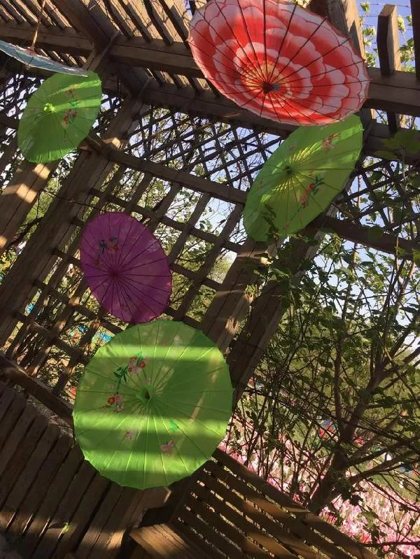 陽光照進(jìn)長廊里,油紙傘閃閃發(fā)光。油紙傘的圖案,都在彰顯中國文化的博大精深。同時油紙傘的寓意代表著多子多福(與“有子”諧音),也是愛情的符號(《白蛇傳》的許仙與白素貞,戴望舒的《雨巷》),傘骨為竹,也代表著節(jié)節(jié)高升,同時也代表著美好、圓滿
