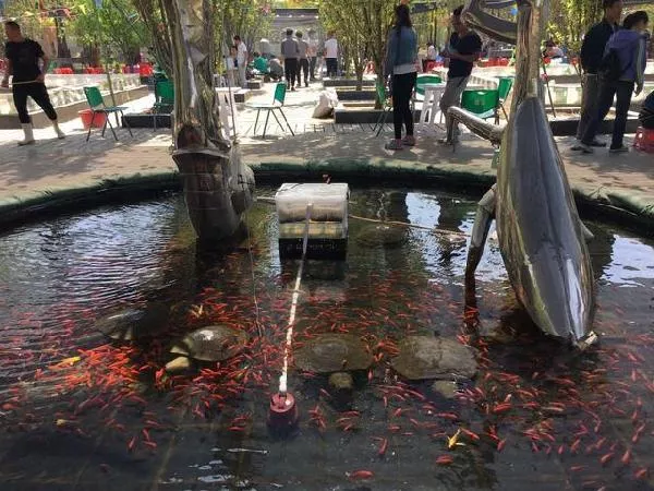 園內(nèi)有一些垂釣,清晰可見的魚群,魚兒似乎沒有那么活躍,大體知道自己面臨被捕。