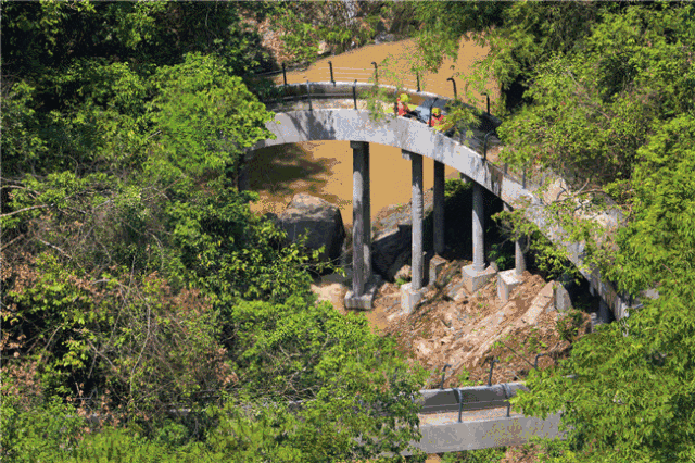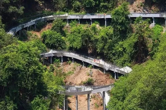 高達200米的落差高度,相當于60多層高樓,一個又一個的彎道在空中盤旋,從高空俯視就像一條盤山公路一樣。
