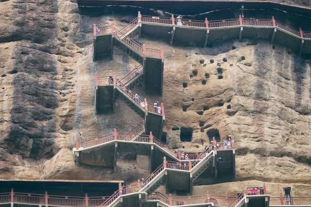 據(jù)說(shuō)當(dāng)年開(kāi)鑿石窟的時(shí)候,是先在周邊山林伐木,然后堆積木材至80米高處,再開(kāi)始施工,搭建一層層的木棧道。古人稱贊曰:“峭壁之間,鐫石成佛,萬(wàn)龕千窟。碎自人力,疑是神功?!?.....