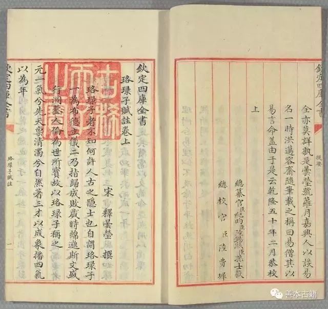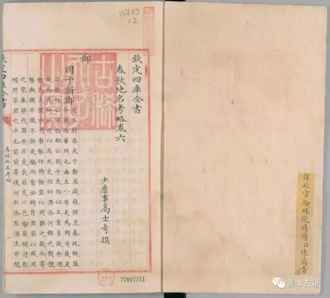 四種殘本形制并同,紅格,八行二十一字。白口,四周雙邊,單魚尾。版心上書“欽定四庫全書”,下雙行小字記書名、卷數(shù)。各卷首行均頂格書“欽定四庫全書”,次行低一格書名、卷數(shù),第三行下書作者、朝代。各冊首葉鈐“古稀天子之寶”白方,末葉鈐“乾隆御覽之寶”朱方。每冊卷前副葉均黏有黃簽,上墨筆楷書題詳校官姓名。