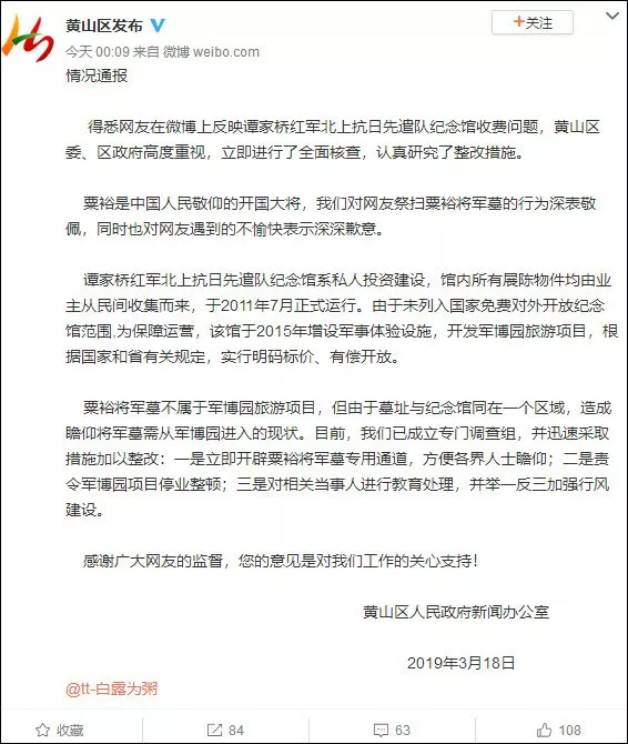 (觀察者網(wǎng)訊)3月17日,有微博網(wǎng)友稱近日赴安徽黃山瞻仰粟裕將軍墓,但墓園所在的紅軍北上抗日先遣隊紀(jì)念館竟然收費95元。19日凌晨,中共黃山區(qū)委黃山區(qū)人民政府信息辦公室官方微博@黃山區(qū)發(fā)布發(fā)布情況通報稱,立即進行全面核查,研究整改措施,責(zé)令軍博園項目停業(yè)整頓。通報解釋,該紀(jì)念館系私人投資建設(shè),館內(nèi)所展陳物件均由業(yè)主從民間收集而來,于2011年7月正式運行。由于未列入國家免費對外開放紀(jì)念館范