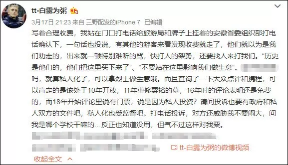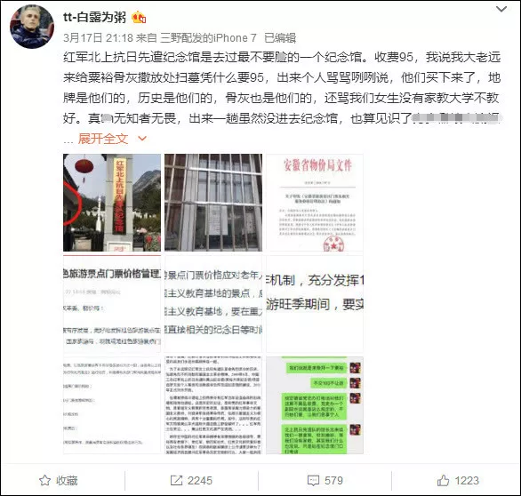 @tt-白露為粥 在微博稱,粟裕墓于2011年重修,某點評網(wǎng)站上顯示2016年還有網(wǎng)友表示這里是免費的。同時展示一份安徽物價局的文件,認(rèn)為紅軍北上抗日先遣紀(jì)念館的這一做法違反了《國家發(fā)展改革委關(guān)于做好紅色旅游景點門票價格管理工作的通知》。