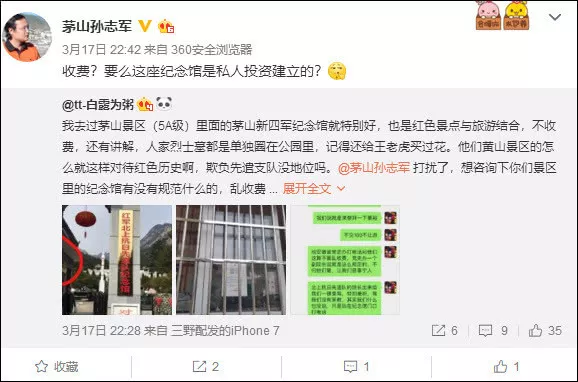 此外,@tt-白露為粥 3就景區(qū)紀(jì)念館的規(guī)范和收費情況,在微博咨詢了同為紅色紀(jì)念館的茅山新四軍紀(jì)念館館長@茅山孫志軍。后者轉(zhuǎn)發(fā)了相關(guān)視頻,并對收費表示疑惑,并稱收費的話可能是私人紀(jì)念館。
