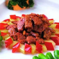 原料 牛里脊肉500克,蒜苗50克,蔥、姜、花生油、紅辣椒、精鹽、醬油、胡椒粉、濕淀粉、味精、香油、豆瓣醬各適量。 制法 1.將牛里脊肉切成3厘米長(zhǎng)、15厘米寬的長(zhǎng)方形薄片,放入碗內(nèi),加濕淀粉拌勻待用;蔥、姜、紅辣椒切成小象眼片;蒜苗切成3厘米長(zhǎng)的段;精鹽、醬油、味精、濕淀粉、胡椒粉加適量水,對(duì)成芡汁待用。 2.鍋內(nèi)放油燒至七成熱,把掛好糊的肉片炸成淺紅色撈出,控凈余油。 3.鍋內(nèi)留少量油燒熱,放入豆瓣醬炒香,再放入蔥、姜、紅辣椒、牛肉片翻炒幾下,隨即將芡汁倒入,再放蒜苗,炒勻后淋上香油,出鍋即可。 特點(diǎn):色澤醬紅,味濃鮮香,甜辣適口。