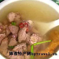 羊湯是山西長治壺關(guān)的傳統(tǒng)名吃,同我省北路雁同一帶的羊雜割湯、南路運城一帶的羊湯泡饃,可稱之為山西羊湯三大流派。壺關(guān)羊湯與另外“兩湯”比較,可謂獨樹一幟,風(fēng)味別具。 喝壺關(guān)羊湯先要講究時令,羊不吃青草了才開始做,吃開青草就停做了,約是從當(dāng)年中秋到次年清明之間七個多月時間。據(jù)羊湯師傅講是怕吃上青草,羊肉帶上青草氣,風(fēng)味受損。羊湯羊湯,羊是基礎(chǔ)。羊湯師傅都能慧眼識羊,百里挑一,在一群羊中挑出三五只一兩年生的上好山羊養(yǎng)在后院待宰,所謂“后院拴羊,前鋪賣湯”,以保就地現(xiàn)宰那種鮮味。羊湯師傅殺羊是絕活,幾近“庖丁解牛,游刃有余”,殺得利索,洗得潔凈,各個部位分得條理清楚。壺關(guān)羊湯一大特點是講究嘗全羊,即一碗湯中要有七八個羊肉餃子、三五個羊肉丸子、幾塊燉肉、血條、脂油與頭、蹄、口條及胃、腸、心、肝、肺、腰等內(nèi)臟切成的條條或塊塊,除羊的皮毛之外,應(yīng)有盡有,連羊骨髓也熬在老湯中,難怪它能大補元氣了。壺關(guān)羊湯又一特點是講究老湯。每座羊湯館里除正鍋外,另設(shè)一口大砂鍋專供燉羊骨架和羊肉塊,此鍋從中秋做湯開始坐在火上,到次年清明止,邊舀邊續(xù),老湯不斷。喝羊湯還要配吃黃蒸才算最好配伍。黃蒸是用黍米面包豆沙、棗泥餡做成的饃,極軟、極甜、極粘,賣黃蒸師傅怕沾在手上,要用木匙抄在盤子里。喝一碗羊湯,吃一兩個黃蒸,熱乎乎、香噴噴,足以稱得上是美餐一頓了。