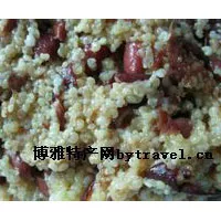黃米蒸飯是臨汾傳統(tǒng)的風(fēng)味食品。制法是將新鮮黃米飯?jiān)跊鏊薪菔畟€小時后,另將紅棗、紅蕓豆放在鍋中煮熟備用;然后將黃米撈出,在大鐵鍋上放上鐵鍻;鋪上蒸飯片,一層黃米一層蕓豆,一層紅棗鋪放,大火蒸一個小時就好。最后在磁面盆中擠壓成糕狀,加上 黃米蒸飯白糖才能食用,口感香軟。制作蒸飯的流程非常多,將新鮮黃米放在水中浸泡6-7小時,另將紅棗、紅蕓豆也在水中浸泡6-7小時,放在鍋中煮熟備用;隨后將黃米撈出,在瓦甑中蒸至半熟;下甑后灑入適量清水,再上甑蒸熟。下甑后用特制的蒸飯圪垛(帶長柄的木球)在瓷面盆中擠壓成糕狀,加入煮好的紅棗和豆子,用鏟子攪拌均勻后,繼續(xù)用蒸飯疙垛擠壓,直到棗、豆、米粘為一體,就可食用了。