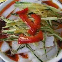 現(xiàn)在,農(nóng)民仍按傳統(tǒng)的方法制作米涼粉。在開水或涼水中把綠豆泡上一段時間。糜米或小米洗凈后,也用水浸泡十幾分鐘。然后把綠豆從水中撈出來,放到盆里,少倒些水,一勺一勺地把綠豆和米及水舀進手磨上磨成漿。再把豆、米漿徐徐地舀進開水鍋里,火要急,邊舀邊用勺子或搟面杖快速進行攪拌。熟后,摻入少量蒿籽,并把它攪勻煮熟。然后,把它鏟出來攤在高粱稈稗子上或均勻地抹在水缸外壁上,晾涼后切成長條,就制成了米涼粉。吃的時候,往米涼粉里舀上酸菜湯,加上蔥花油、辣椒、芝麻面、芥末粉或炒茴香面等調(diào)味品,涼陰陰、酸溜溜的,非??煽?。夏令時節(jié)吃米涼粉,尤其覺得爽口入味,清淡宜人。