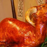 蒙古族肉食品之二是烤全羊。這是從元代宮廷燕饗繼承下來(lái)的一種整羊宴。在清代頗受清廷青睞并稱“詐馬宴”,常招待蒙古王公。清乾隆帝曾大發(fā)詩(shī)興,作詩(shī)贊美此宴。“詐馬”即蒙古語(yǔ)“珠馬”或“招木”的異譯,指的是用蒙古族傳統(tǒng)的屠宰法殺之后,熱水煺毛,去掉內(nèi)臟,收拾干凈的白條綿羊烤制的一道名菜。其色、香、味、形俱佳,是蒙古肉食中最講究烹調(diào)技藝的上乘大菜。 據(jù)《元史》記載,十二世紀(jì)時(shí)蒙古人“掘地為坎以燎肉”。到了元朝時(shí)期,蒙古人的肉食方法和飲膳都有了很大改進(jìn)。《樸通事·柳蒸羊》對(duì)烤羊肉作了較詳細(xì)的介紹:“元代有柳蒸羊,于地作爐三尺,周?chē)曰馃?,令全通赤,用鐵芭盛羊,上用柳枝蓋覆土封,以熟為度?!边@說(shuō)明不但制作復(fù)雜講究,而且用專門(mén)的烤爐。在清代各地蒙古王公府第幾乎都用烤全羊招待貴賓,是高規(guī)格的禮遇。 清代初康乾年間,北京“羅王府”(即阿拉善王府)的烤全羊,名氣就很大,其蒙古族廚師嘎如迪名滿京城。從清末明初到新中國(guó)成立初,各地蒙古王府中雖有烤全羊,唯有阿拉善王府的烤全羊最有名,因?yàn)樵撏醺幸慌院救驇煘槭椎拿麖N掌爐。新中國(guó)成立后,由于人民政府對(duì)蒙古族傳統(tǒng)名菜的重視,不但恢復(fù)了這道名菜,而且有了許多改進(jìn)。現(xiàn)在我區(qū)財(cái)經(jīng)學(xué)院已將烤全羊列為蒙餐課烹調(diào)技術(shù)中的重要一章。 烤全羊的制作法簡(jiǎn)單說(shuō)來(lái),即把“珠馬”白條綿羊帶頭蹄用特備的裝置吊好,再將各種調(diào)味品放入預(yù)先切好的切口和腹腔內(nèi),然后在表皮上涂一層食用油,再裝入特制烤爐中烤制。大約烘烤三個(gè)多小時(shí),便是一只外皮酥香,味美肉嫩的烤全羊了。按照一般規(guī)矩,宴席上五道菜后,才把烤全羊置于大盤(pán)端來(lái),請(qǐng)賓客觀賞之后,再把它端回去,按皮和肉分別切成片或塊重新上桌供食用。吃時(shí)可隨意用合葉餅,夾著肉和大蔥、甜面醬等佐料吃,卻也別有一番風(fēng)味。