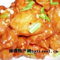 鍋包肉是東北的溜肉段衍生出來的一道菜,也是伊春較著名的菜肴之一。因外面包著用土豆做的淀粉,放在油鍋里炸,所以又叫“鍋爆肉”。 幾乎下館子的人都品嘗過。不論是裝修豪華的星級酒店還是簡易路邊的家庭快餐菜譜都寫有此菜,可見其深受大眾喜愛之程度。尤其深得女子和小孩子的口味。 制法:豬里脊肉改刀成7厘米長、5厘米寬、0.2厘米厚的大片,用精鹽、料酒拌勻碼味;用水淀粉及少許色拉油調(diào)成稠糊;另用番茄醬,醬油、白糖、醋、味精、鮮湯、水淀粉等對成滋汁。炒鍋置火上,放入色拉油燒至六七成熱,先將碼好味的肉片與稠糊拌勻,再一片片展開,逐一下入鍋中,炸至外酥內(nèi)嫩時撈出瀝油。鍋留底油,投入姜絲、蔥絲炸香,下入炸好的肉片,烹入滋汁,翻拌均勻后起鍋裝盤,撒上香菜即成。色澤金黃,外酥內(nèi)嫩,酸甜可口。