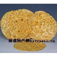 斜角兒的加工比燒餅簡單多了。加工者將酵團(tuán)經(jīng)搓按壓扁拉長,將蔥油、細(xì)鹽抺于中間,再將兩邊相合,用燒餅槌兒滾過再拉長,將糖粞涂于面上,撒上芝麻,這樣成了一條酵面的長帶子攤在案板上,加工者執(zhí)刀斜切,每塊成平行四邊形,再烘烤而成,斜角兒之名即由此得來。斜角兒價格低、口味香、有韌性,夏季新菜油上市,吃斜角通常蘸菜油,這樣吃起來更覺爽口。缸爿,做法和斜角兒差不多,只是中間有肉餡兒,加工者用刀橫切,成長方形,涂上糖粞,撒上芝麻貼于桶爐。缸爿這個名取其形狀,有點象陶器缸片。