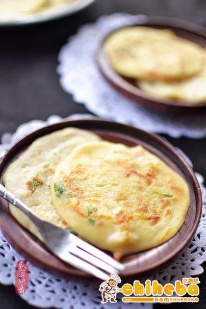 材料:白蘿卜1個,雞蛋2個,面粉200克,玉米粉50克(玉米粉不能放得太多,不然餅會變硬),鹽、雞精少許。 做法:蘿卜擦成細絲放入盆中,將雞蛋打入,用筷子順著一個方向攪拌;加入鹽、雞精(喜歡甜的,也可以換成糖),再順著一個方向攪拌;倒入面粉、玉米粉,還是順著一個方向攪拌,攪至盆中面粉呈糊狀為止;將蘿卜糊放在一邊醒一下,大約10分鐘左右,再順著一個方向攪拌一會兒。在鍋中倒入少量的油抹勻;倒入蘿卜糊于鍋中;用平鏟輕輕推開,使糊均勻地鋪在鍋里;等煎餅底部硬實,用平鏟輕輕翻身,烙背面,烙至兩面發(fā)黃即可上桌。