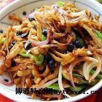 3、下洋蔥絲、青椒絲煸軟,再將小銀魚干倒入,翻炒均勻,調(diào)入少許鹽(豆豉有咸味,鹽一定要少加),沿鍋邊略加入少許水;