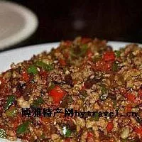 3.在炒過(guò)的肉末中加入尖椒碎丁和玫瑰咸菜粒,大火再炒5分鐘,調(diào)入雞精和香油,炒拌均勻即可。