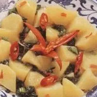 薯仔10兩(約400克),青色雪里蕻4兩(約160克),紅椒1只,糖1茶匙,油2湯匙,水約1杯,鹽適量。