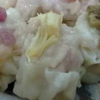 ③燒賣皮平攤在手掌,放上餡,順手捏緊使之直起,并在齊口處咯用力捏緊,若有餡心擠出,可撳按入內(nèi),口子略為張開(kāi),上放一二只蝦仁,即成燒賣生坯。