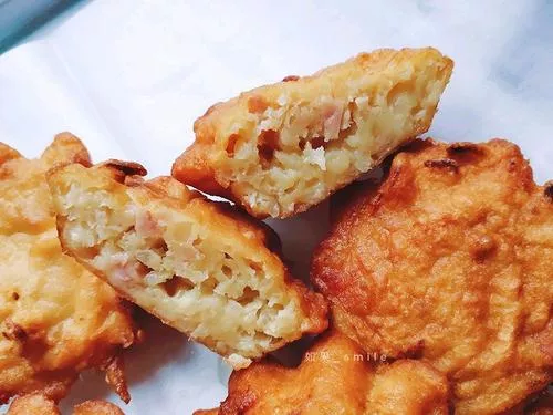 原料: 精面粉250g、熟豬油80g、蘿卜絲300g、豬板油200g、火腿絲50g、白芝麻少許 調(diào)料(味): 食油、味精、蔥末、胡椒粉各適量 制作: 1. 先用豬油、水與面粉調(diào)成水油面和干油酥,再將水油面按扁,包入干油酥,并搟成長(zhǎng)方形薄皮,把油酥面團(tuán)分三份疊起,順長(zhǎng)搟開(kāi)卷成長(zhǎng)筒狀,用刀平均分成8份,再每份對(duì)切,刀口向下,搟成坯皮包入蘿卜絲餡,然后在收口處沾上白芝麻待用 2. 將油鍋置中火處,倒入1500 g食油,待三至四成熱時(shí),放入火腿蘿卜絲餅生坯,待制品浮起,餅的中間稍硬,色澤淡黃即可 特點(diǎn): 層次清晰,口味鮮香,口感酥松 主要營(yíng)養(yǎng)成分: 蛋白質(zhì)89g 脂肪326g 糖203g 鈣130mg 膽固醇352mg 熱量4102kcal( 寧波)