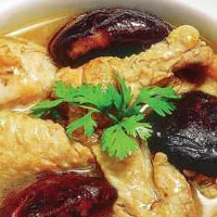 蘑菇雞,它是由山養(yǎng)的本地公雞,加上這里的野蘑菇烹飪而成。椐說公雞要三年左右為最好,這樣燉出的雞、肉壯、肉絲精細、鮮美可口、香味濃濃。