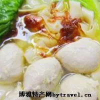 云霄特產(chǎn)水面,其實(shí)跟我們通常說(shuō)的“清湯面”差不多,只不過(guò)云霄人把清湯面玩出了一點(diǎn)新花樣。“一要把面粉攪出筋來(lái)才做面條;二要湯鮮,肉丸湯加豬骨湯,那湯便有味了;三要澆頭好,清湯水面還要澆上幾粒餛飩和肉丸。別處的餛飩餡用肉茸或千刀肉,我們?cè)葡龅酿Q飩用碎肉,入口能咬出小肉塊,方能吃出肉香。而肉丸,是把新鮮瘦豬肉打成肉茸,再加玉米淀粉做成,吃到嘴里脆響。最后,澆上一點(diǎn)用豬油炸成金黃色的蔥頭,便滿碗葷香了。如今也有人把面條用蔥油、生抽干拌,再配一碗餛飩、肉丸湯,吃法變了,但水面不變,還是干濕共生?!辟u水面的小吃店老板介紹說(shuō)。