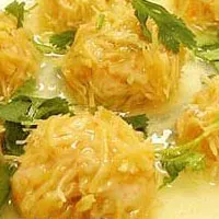 6.鍋置旺火上,倒入上湯200毫升,燒開(kāi)后加少許味精、濕淀粉勾芡成薄芡,淋在繡球上即成。