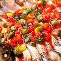 蝴蝶魚?。ê~餃)魚片鹽酒腌漬,瘦肉、膘肉、蝦米、香菇和濕團(tuán)粉做成肉餡,將薯粉碾碎熔開取魚片(一片)做成圓形餃兒皮,包肉餡做成蝴蝶形,在沸水中氽熟后在冷水中漂冷。做菜時用高湯,青菜煮沸,魚皮肉餡,形似蝴蝶。一般材料做出清雅大方的名菜,實屬難能可貴。